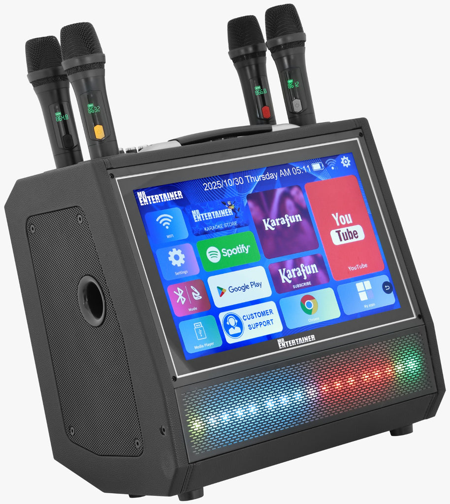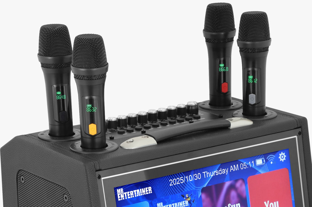 Upgraded MAESTRO PRO combines a large 15.4" Android touchscreen with a high-power PA system and four wireless microphones for the ultimate karaoke experience.